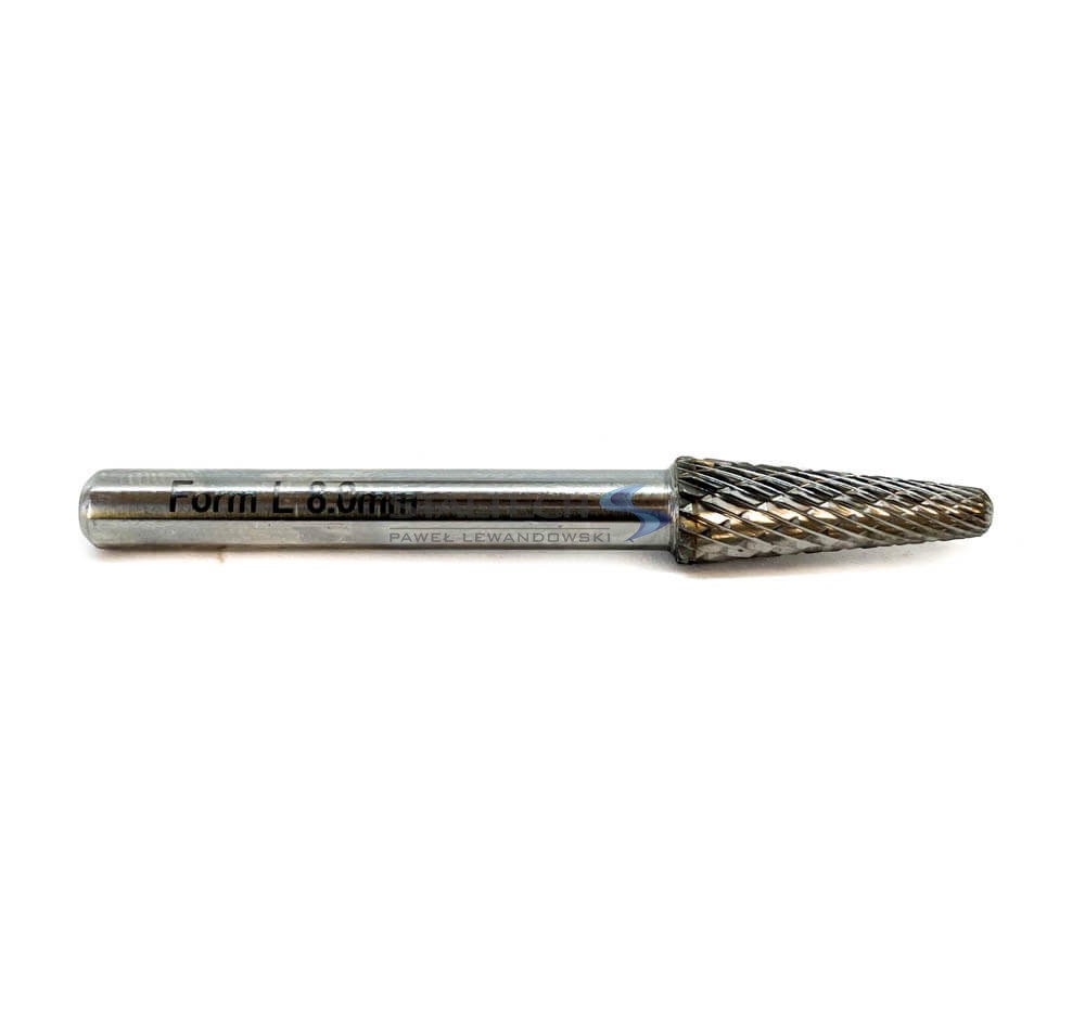Trzpieniowy pilnik obrotowy (frez palcowy) typu L (KEL) marki Festa wykonany z węglika spiekanego wolframu. Pilnik obrotowy TYPU L posiada łeb stożkowy, zaokrąglony. Dostępny jest w rozmiarze 6 mm, 8 mm, 10 mm i 12 mm do wyboru.